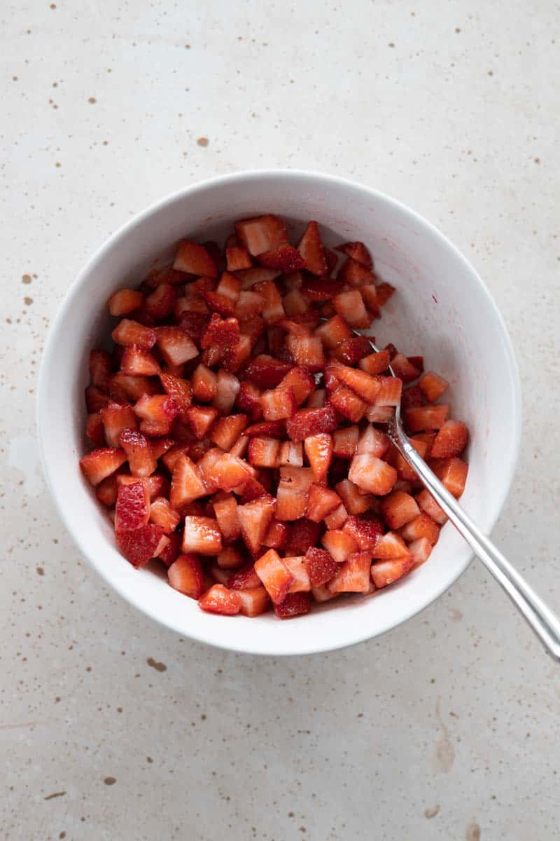 - While the dough rises, make the macerated strawberries. Dice your strawberries and combine with 2 Tablespoons granulated sugar in a small bowl. Cover and let sit for at least 45 minutes to draw out the juices, stirring occasionally.