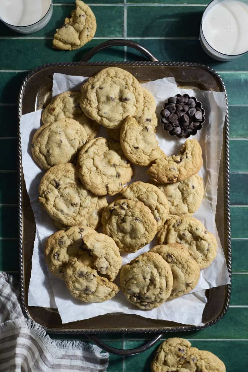 These Sourdough Discard Chocolate Chip Cookies are a delicious cookie with a chewy center and crisp edges that is packed with chocolate chips and sourdough tang. It's made using sourdough discard, but can also be made with active starter if you prefer!