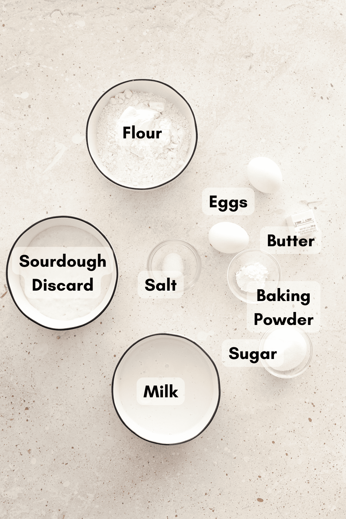 - Sourdough discard: You want your sourdough discard to be unfed and at room temperature for this recipe. This recipe is designed for a sourdough starter with a 1:1 ratio (when you feed your starter, it's with 1 part flour and 1 part water). If your sourdough starter has a different ratio, you may need to adjust some of the ingredients in this recipe.